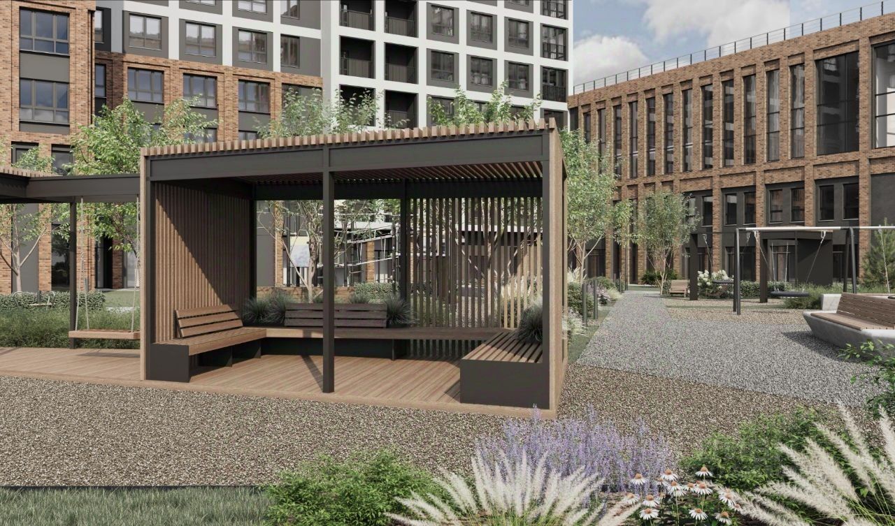 Внутренняя территория полностью закрыта от машин и посторонних людей, что создает комфортные условия для прогулок и отдыха для всех членов семьи в любое время дня и ночи.