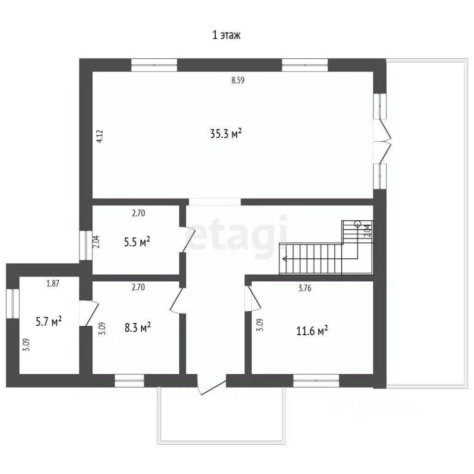 Второй этаж с потолками 2,6 м представляет собой приватную зону с четырьмя изолированными комнатами, санузлом и ламинатом на полу. К дому примыкает открытая веранда 30 кв. м и крыльцо 8 кв. м для отдыха на свежем воздухе.
